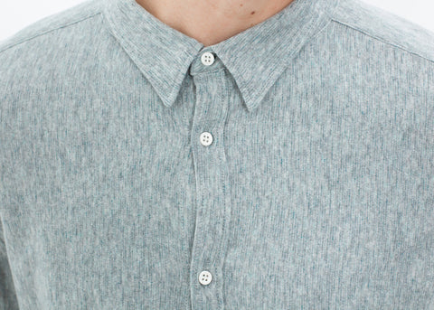 V:Room takes the classic button up and plays it casual by giving it a contrasting fabric inside. Curved hem with side splits. Color Blue/Grey. 100% Cotton. Matt is wearing a size Large. Matt is 6’2”, Chest 38”, Waist 31”, Inseam 34.5”.